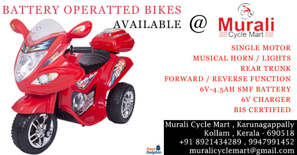 Established in the year of 1982, Murali cycles has been successful in emerging as one of the largest Play Mates bicycle distributors in Karunagapally (Kollam district) because of their dedication and precision to sell and service bicycles and battery bikes of topmost quality. With an expanding range of cycles of Play Mates BICYCLE , murali cycles will help you in finding your dream cycle that pedals your spirit! Murali cycles deals in selling and servicing of Play Mates BICYCLES and also pertaining parts and accessories. The team at Murali cycles strive to create customer satisfaction without compromising in the quality department.